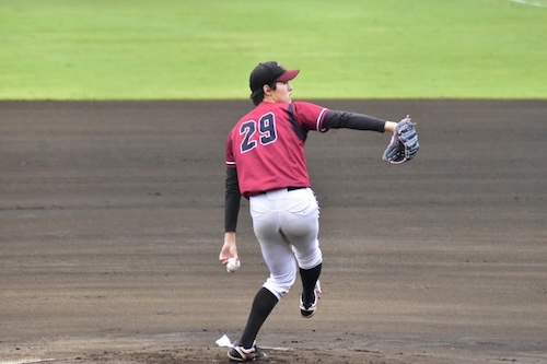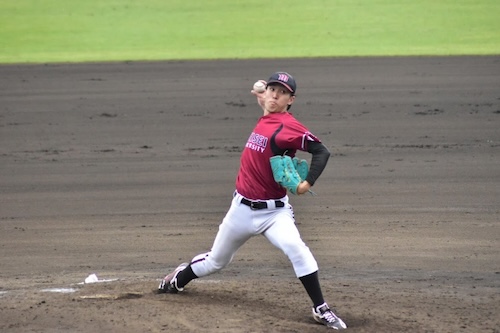 本学の先発・鈴木羚也(経営学部経営学科3年・花咲徳栄)は、ランナーを出しながらも要所を締める粘りのピッチングを見せます。