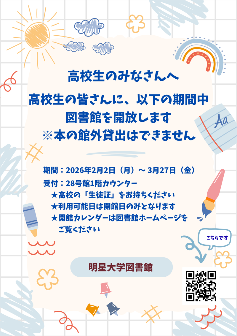 春休み期間中、明星大学では近隣に在学・在住の高校生の皆さんに向けて、図書館を開放します。