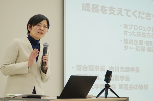 報告会の冒頭では、「明星SATOYAMAプロジェクト」の発起人である理工学部 総合理工学科の柳川亜季准教授が登壇し、本プロジェクトに関わってきた教職員、学生、地域関係者への感謝の言葉とともに、4年間の歩みを振り返りました。