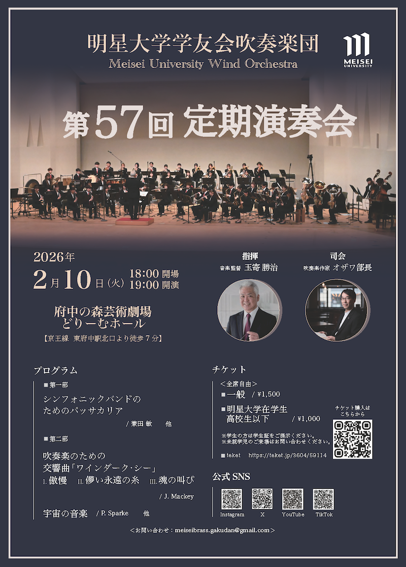 明星大学学友会吹奏楽団は、2026年2月10日(火)に第57回定期演奏会を開催いたします。会場は 昨年、都大会で金賞を受賞し、全日本吹奏楽コンクール初出場を果たした、府中の森芸術劇場どりーむホール。初めて挑んだ全日本吹奏楽コンクールで積み重ねた経験が、今年の演奏に確かな深みをもたらしました。全国の舞台で育った力を携え、“成長した明星サウンド”が今年の定期演奏会でさらに花開きます。心に響く一夜を、ぜひ会場でご体感ください。