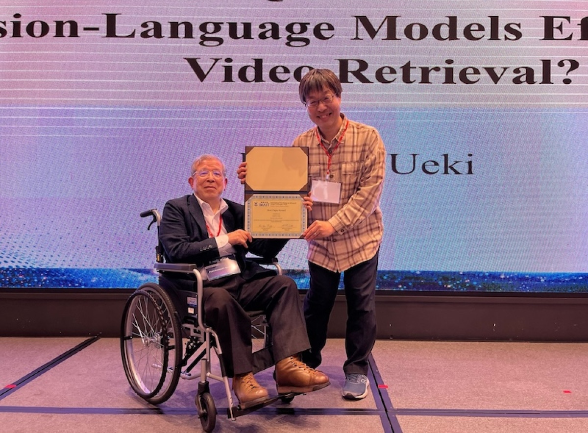 植木一也准教授の発表は、映像検索の精度向上を目的として、視覚言語モデル(Vision-Language Models:VLM)を用いた新しい再ランキング手法を提案しました。初期検索で得られた候補映像に対し、YES/NO形式の質問をVLMに与えて再評価することで、映像内容に対する意味的理解を反映したランキングを実現し、TRECVID映像検索ベンチマークにおいて平均適合率(mAP)の大幅な向上を確認しました。本研究は、Best Paper Competition Session において発表され、Best Paper Award を受賞しました。