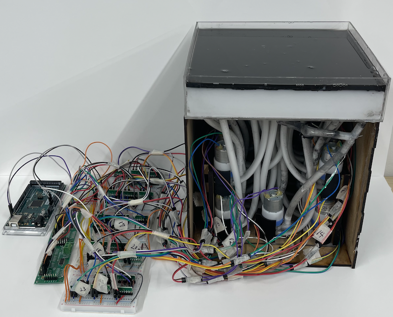 清水さんの発表は、水と油からなる二層液体構造を用い、水面そのものを表示媒体として利用する新しいインターフェースについて報告しました。ポンプ制御により水面にピクセル状の隆起を生成し、文字や図形を動的に表示することで、液体の物理的特性を活かした有機的で柔軟な情報表現の可能性を示しました。