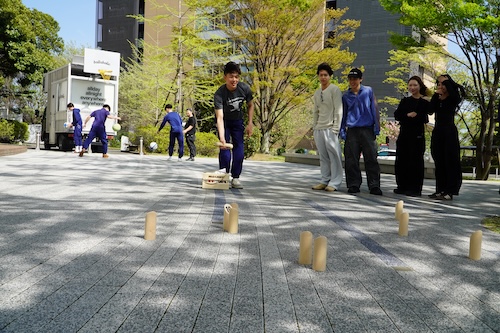 さらに、モルック体験コーナーも設けられました。複数カテゴリーで試合が行われる本大会では、どうしても待ち時間が生じる場面がありますが、そうした時間も来場者に楽しんでもらおうとする運営側の工夫によるものです。場所を選ばず誰でも気軽に参加できる競技であることから、コミュニケーションが生まれやすく、本学男子籠球部の運営における定番の取り組みとして、会場の賑わいづくりにもつながっていました。